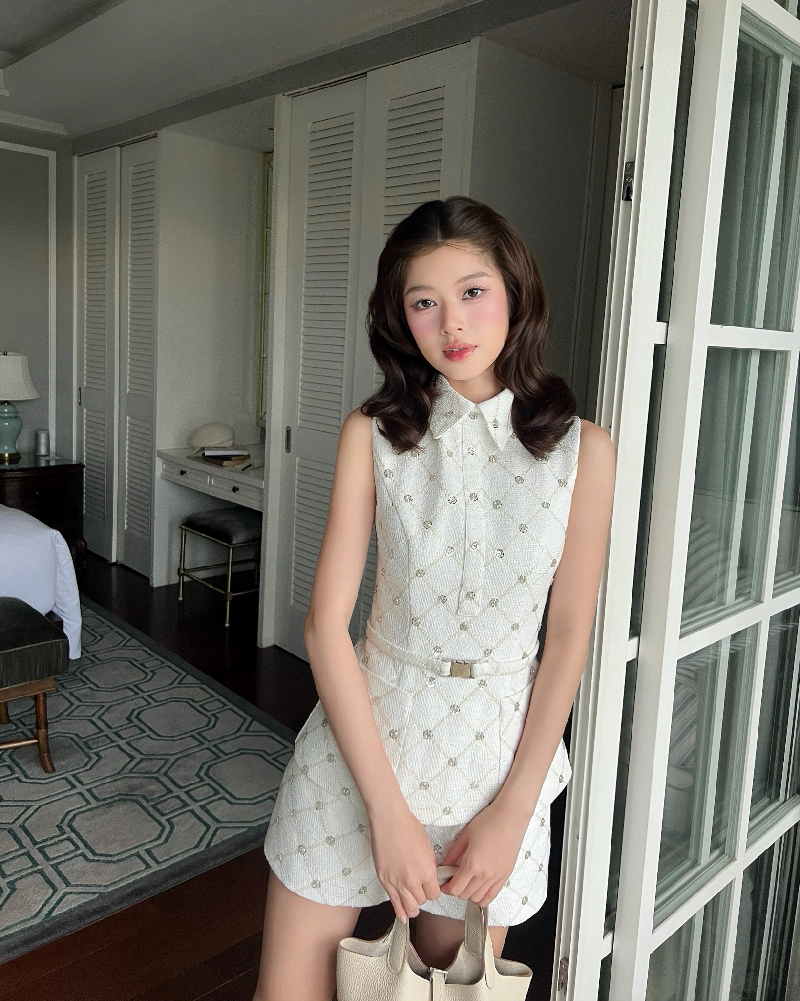 Doll Set là lời thì thầm dịu dàng mà Veo’s gửi đến những cô gái yêu nét đẹp tinh tế và trẻ trung. Trên nền chất liệu tweed đính cườm tỉ mỉ, từng đường họa tiết khối chéo được dệt đan như ôm lấy đường cong cơ thể, tạo cảm giác thon gọn và tôn dáng một cách tự nhiên. Thiết kế cổ đức cổ điển hài hòa cùng dáng áo không tay năng động, mang đến vẻ đẹp cân bằng giữa nét thanh lịch và trẻ trung. Hoàn thiện tổng thể là đai thắt lưng chốt kim loại đặc trưng của Veo’s - một chi tiết nhỏ nhưng đủ để tạo nên một ánh nhìn ấn tượng.