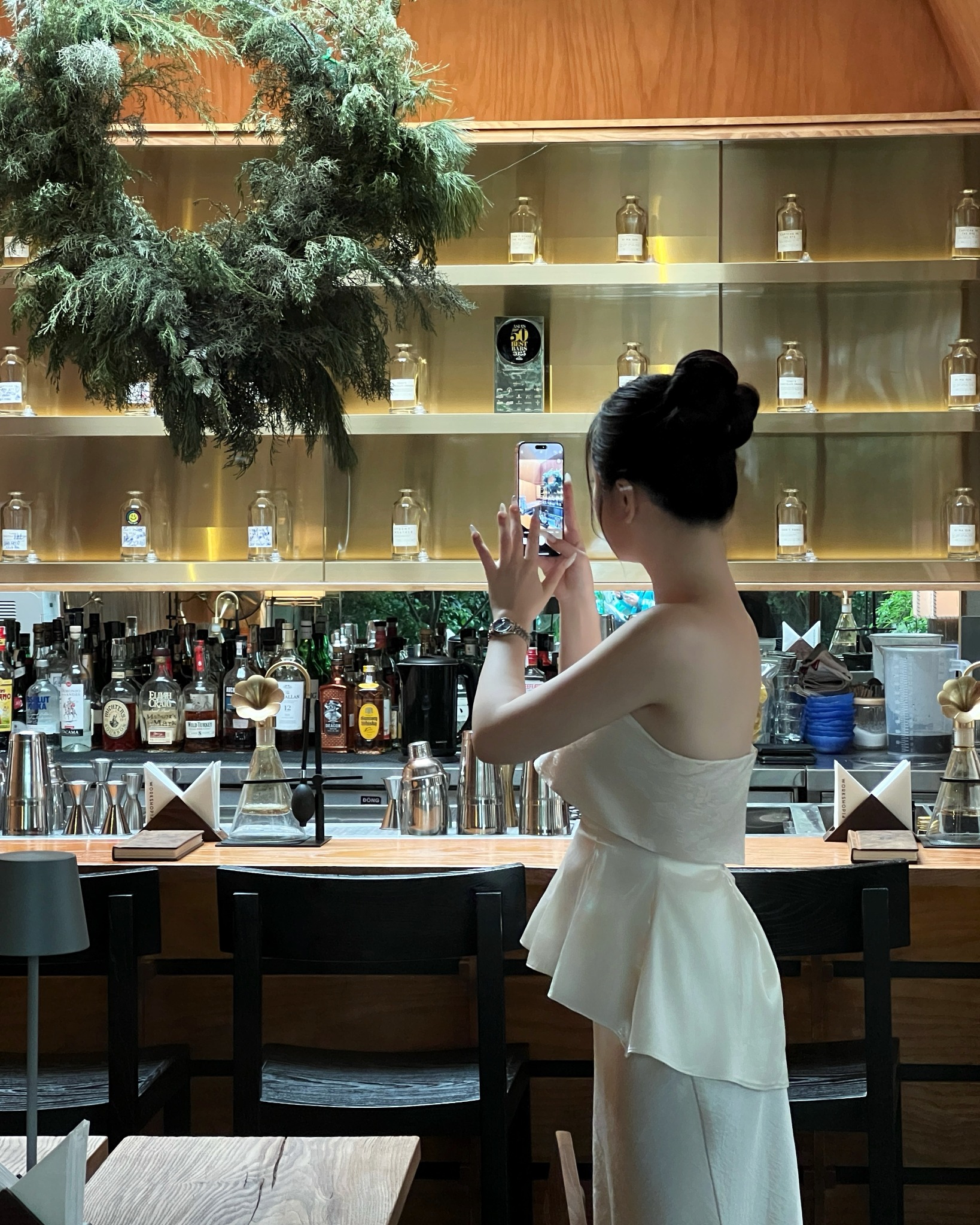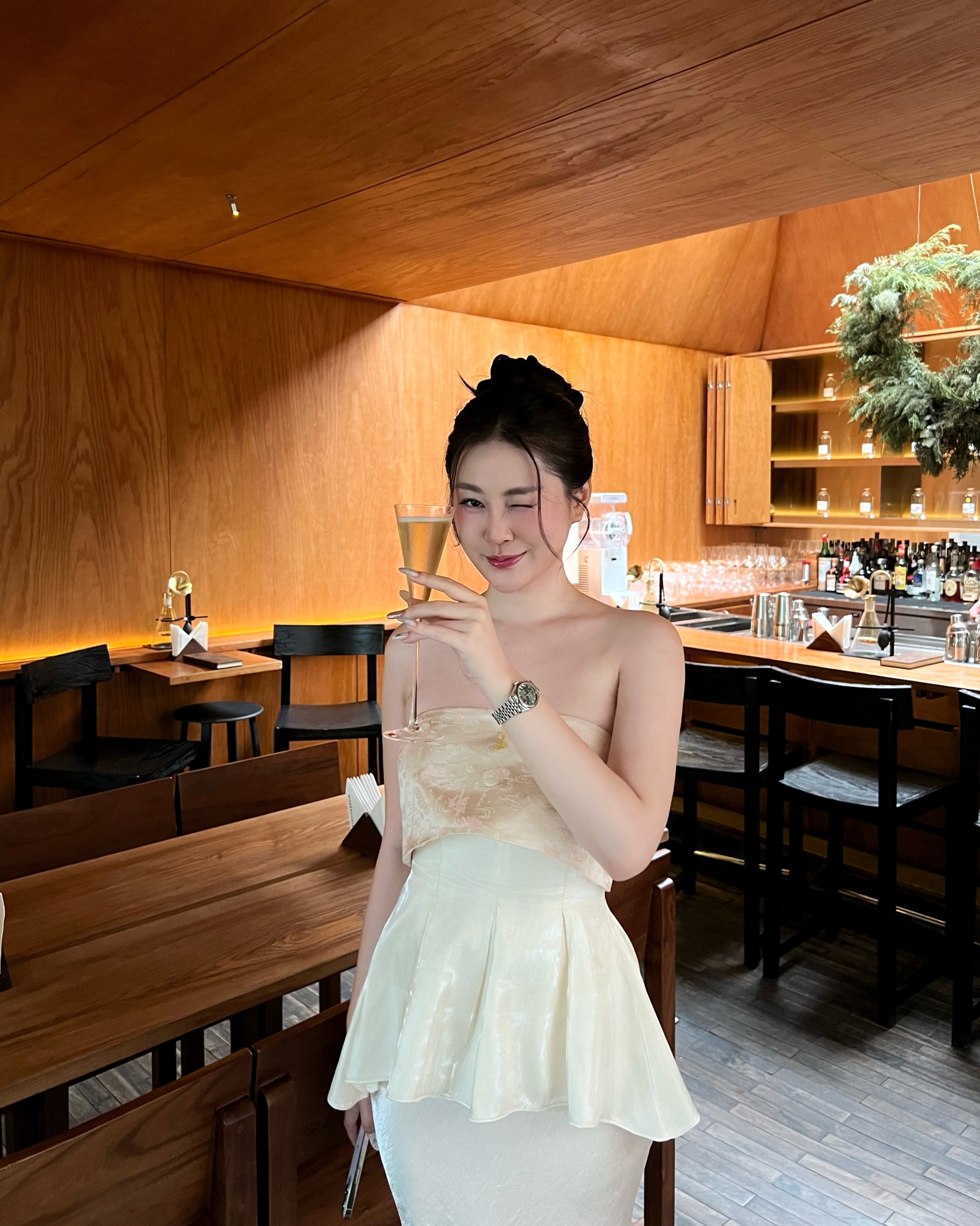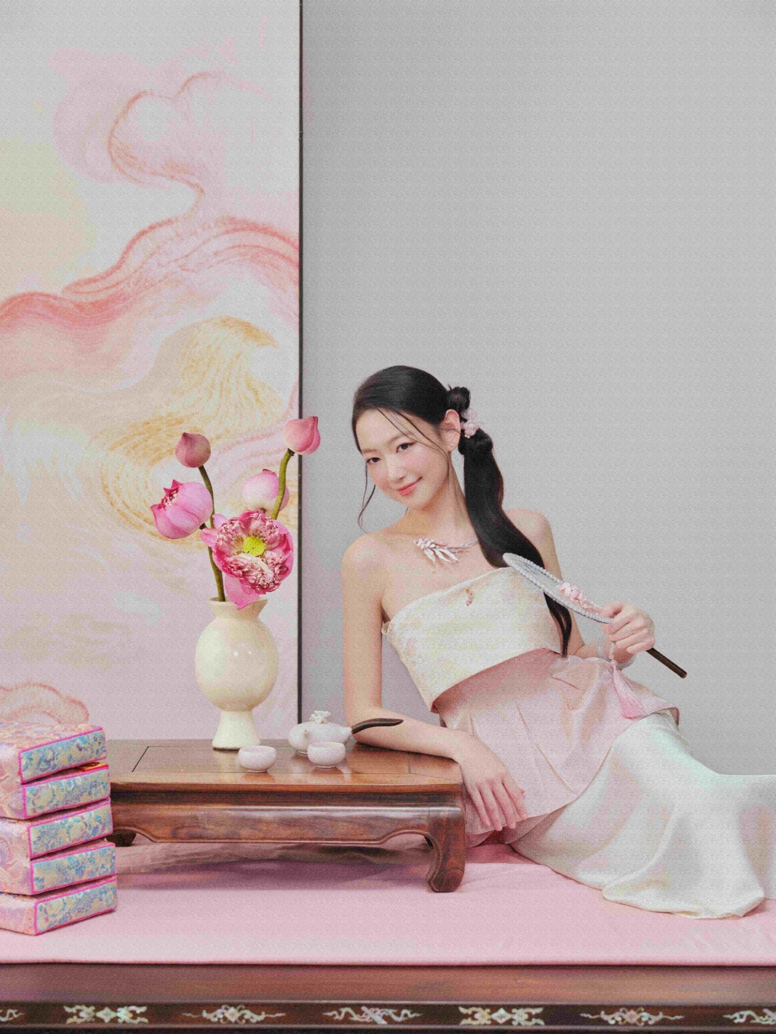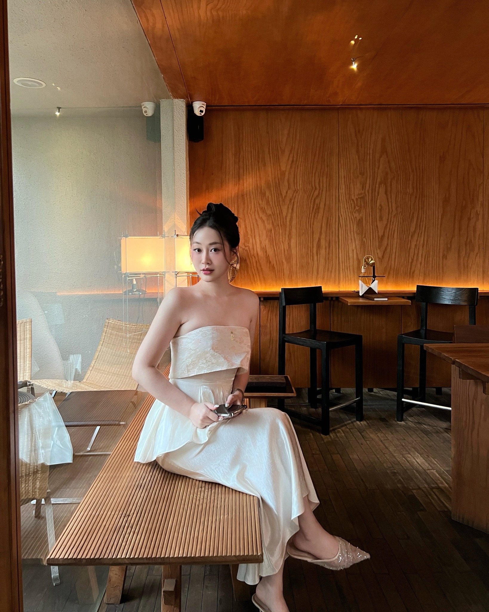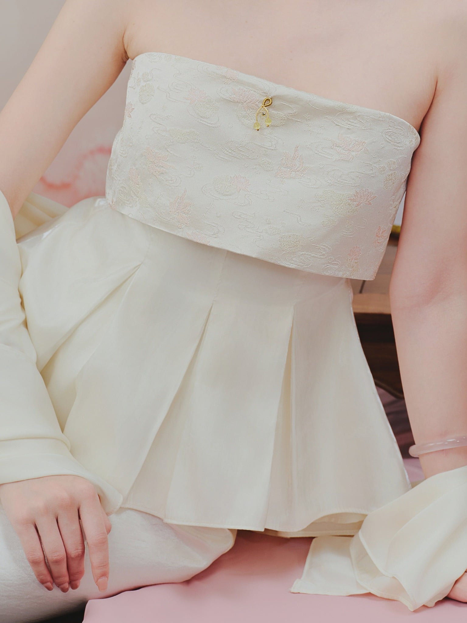 - Điểm nhấn của thiết kế nằm ở phần thân xếp ly từ tơ lụa óng, mềm rủ và bay nhẹ theo từng chuyển động. Các nếp ly được xử lý tỉ mỉ, tạo hiệu ứng xoè nhẹ ở eo, vừa che khuyết điểm, vừa tôn đường cong một cách thanh thoát.