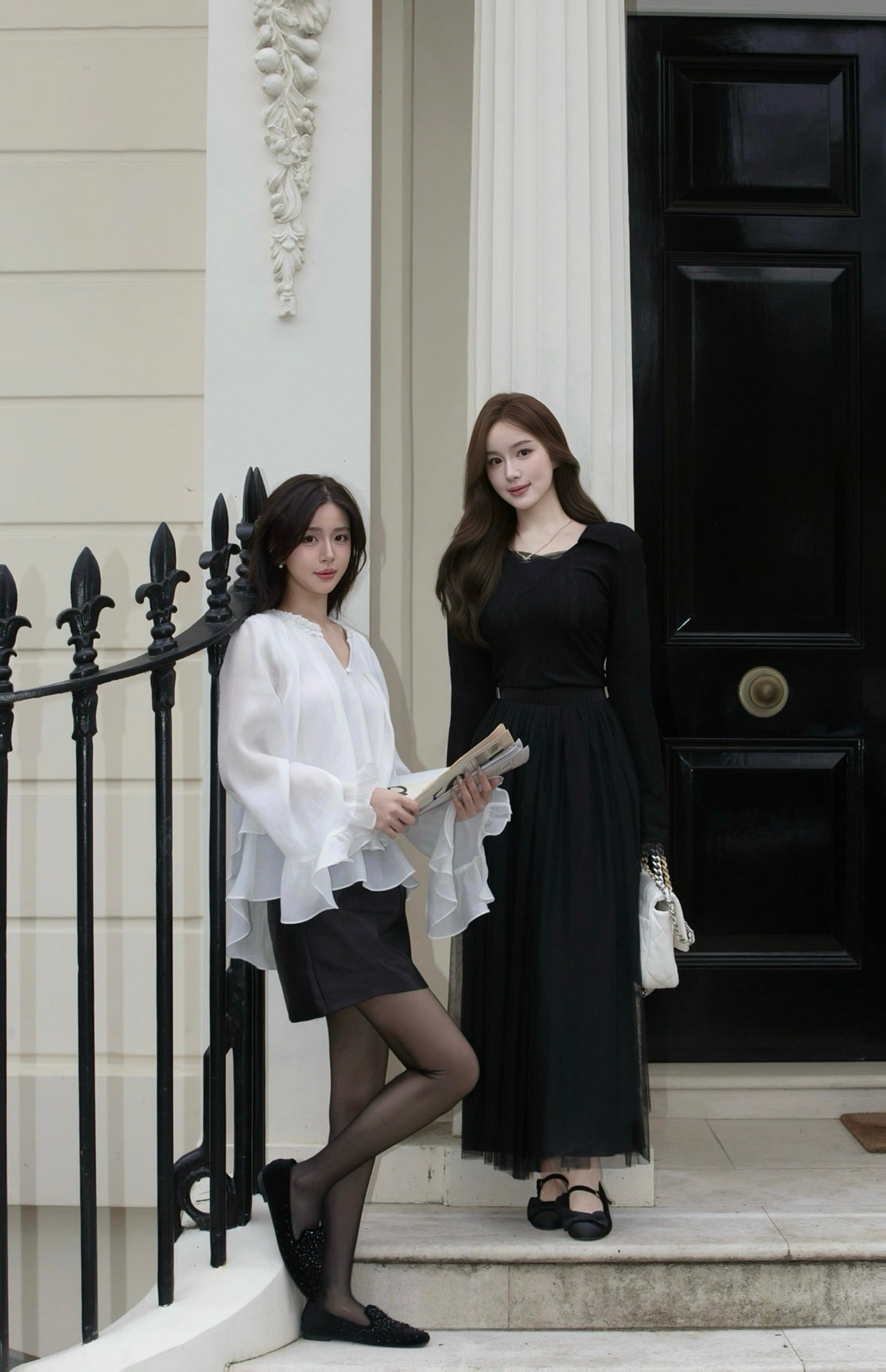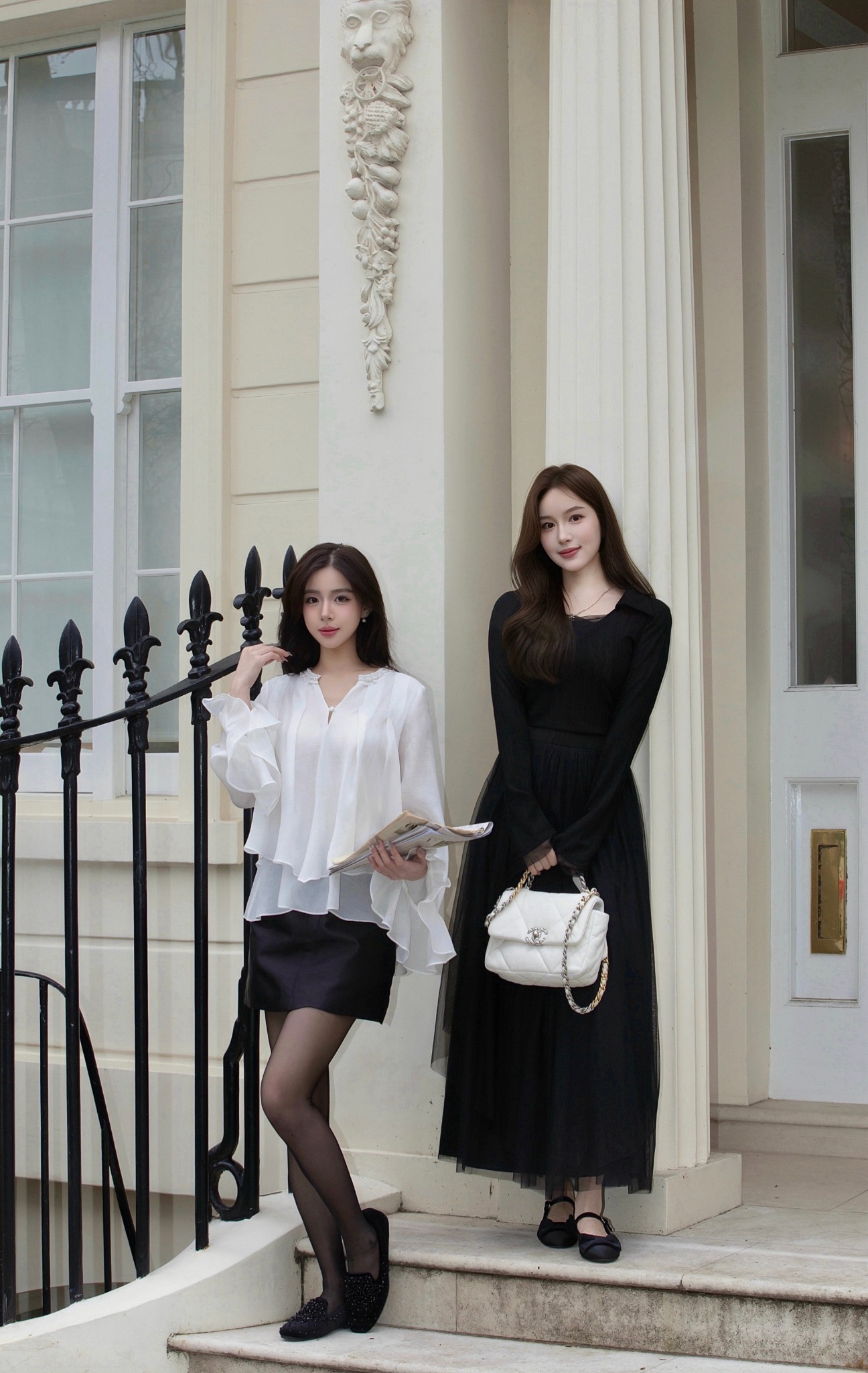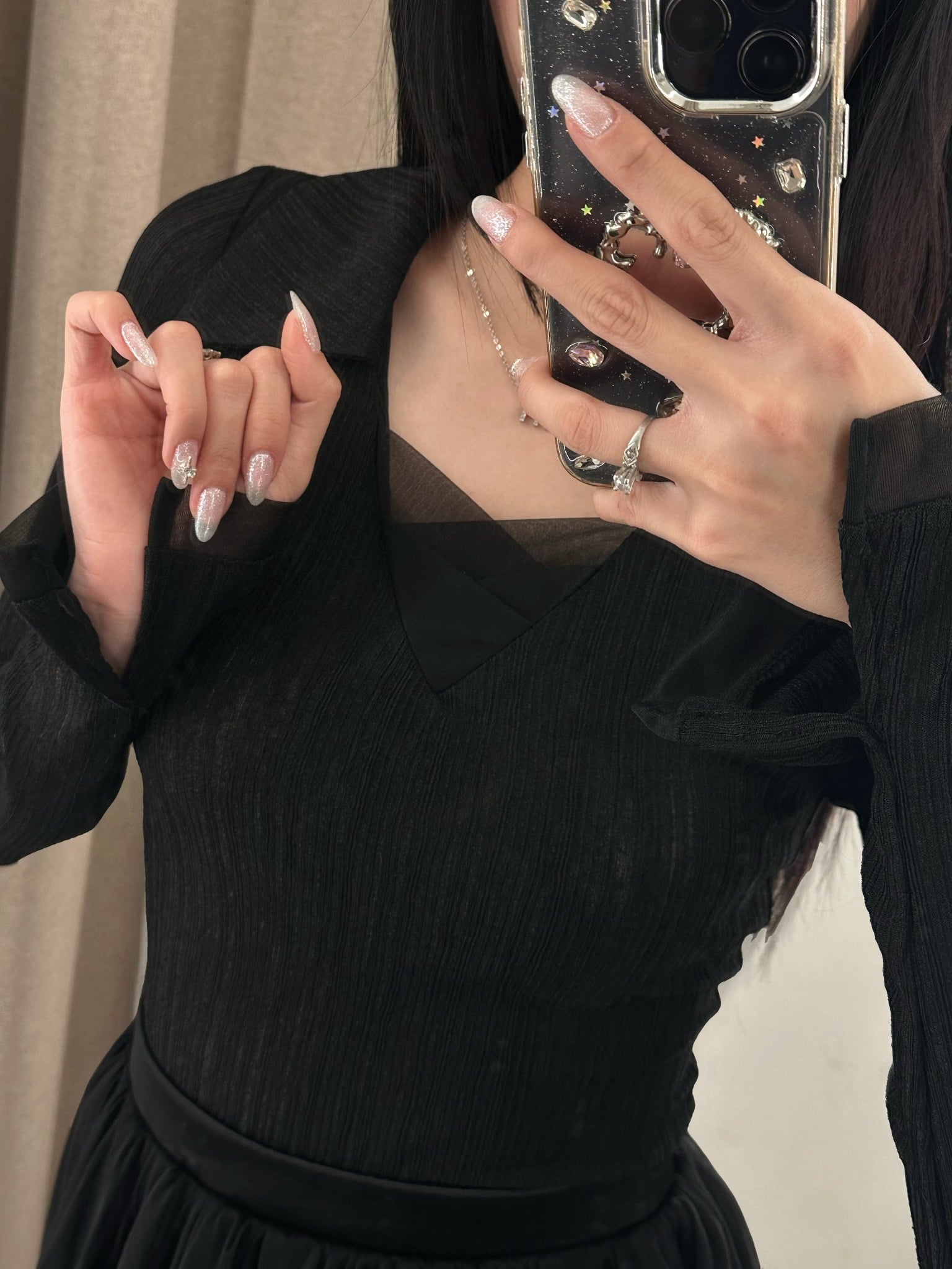 - Chi tiết cổ dạng cổ bẻ, mở phía trước tạo cảm giác thanh lịch pha chút quyến rũ hiện đại. Tay dài may bằng voan xuyên nhẹ, rủ tự nhiên theo chuyển động, giúp tổng thể trở nên bay bổng và sang trọng hơn so với áo thun cơ bản.