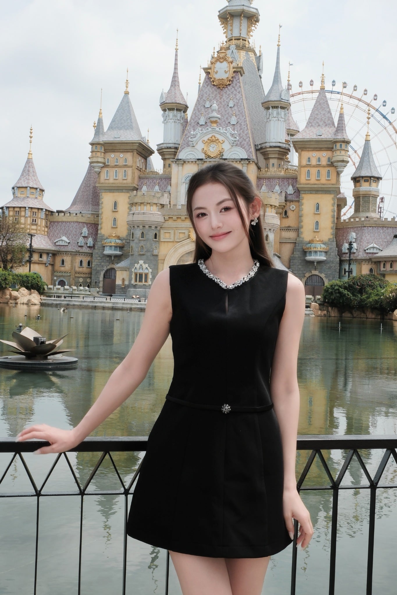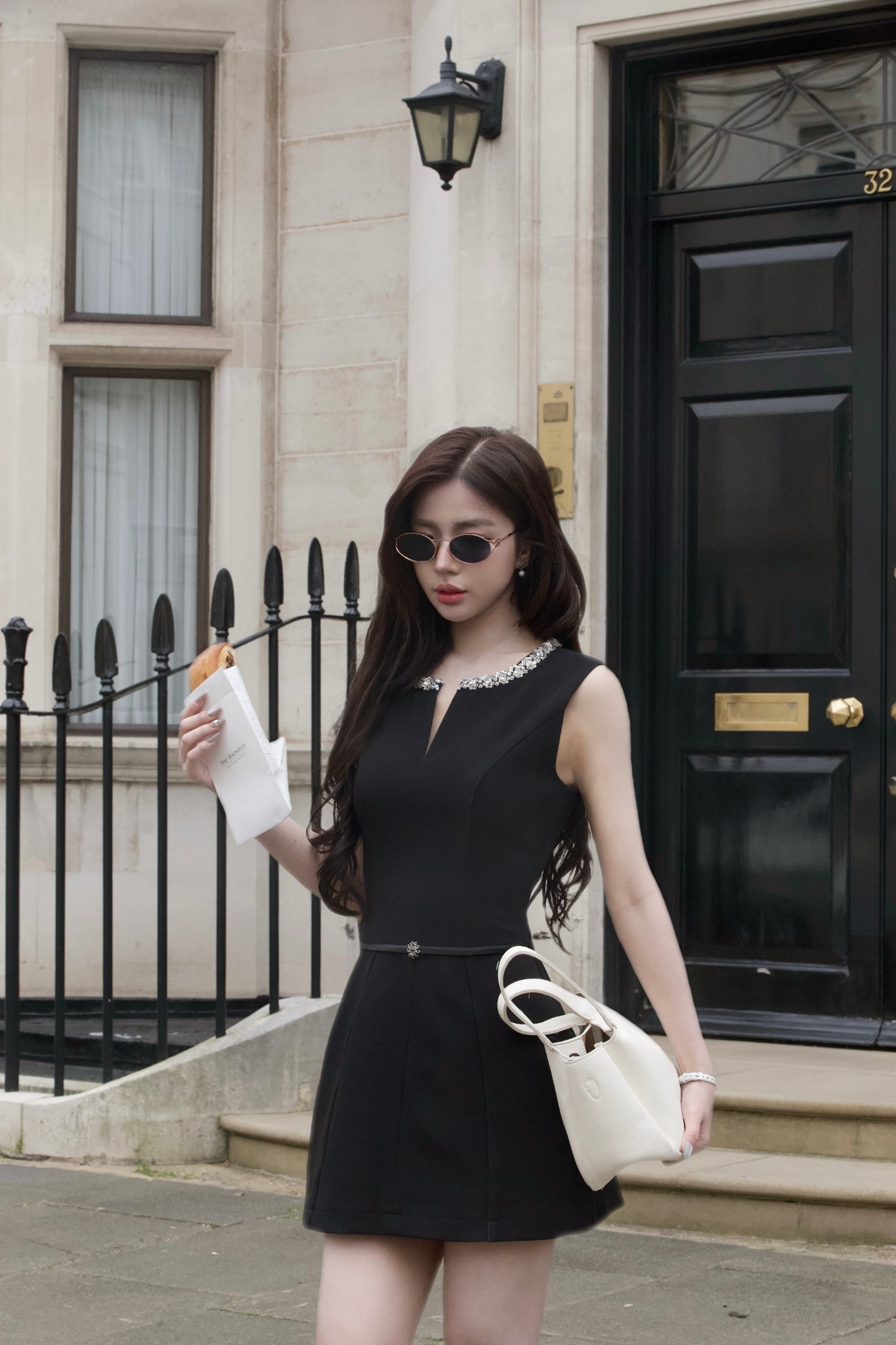 - Thiết kế cổ tròn phối viền đá trắng tinh tế, kết hợp đường xẻ V nhỏ phía trước tạo điểm nhấn.