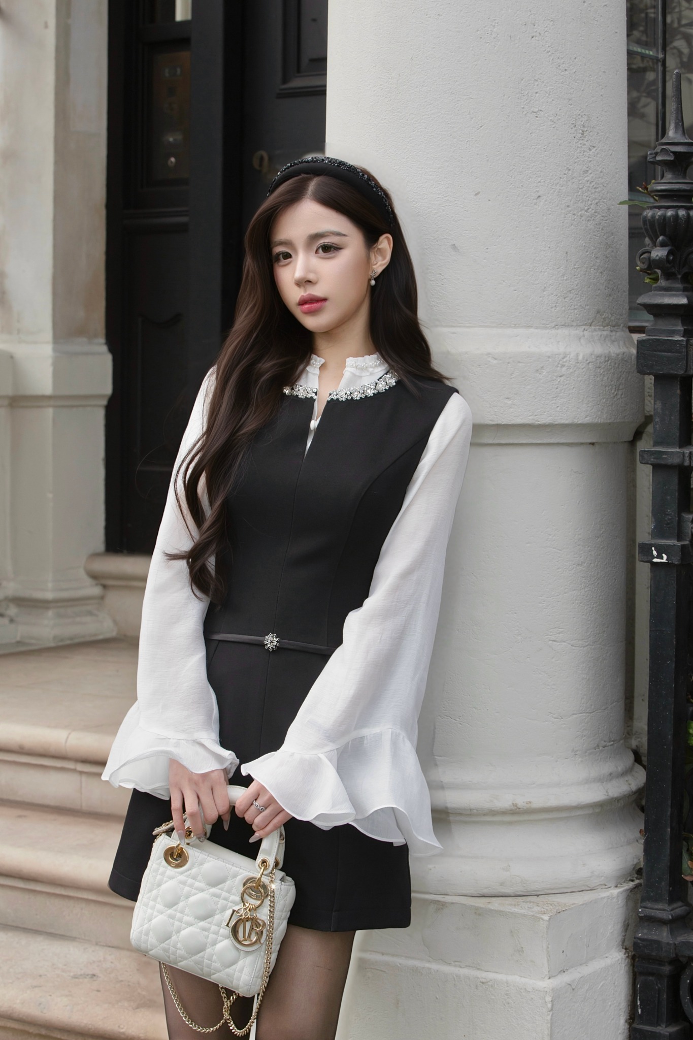- Phần thân dưới dáng chữ A nhẹ, che khuyết điểm đùi và giúp tổng thể trông gọn gàng, thanh lịch. Đi kèm thắt lưng mảnh bằng lụa cùng chi tiết cổ đính đá ở chính giữa giúp nhấn eo.