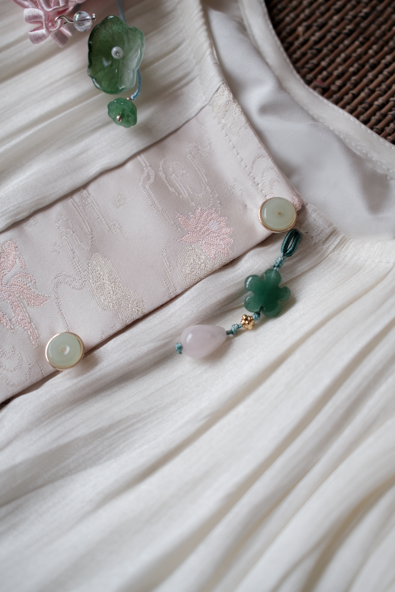 - Chi tiết hàng cúc, mặt ngọc bích treo áo điểm thêm sắc xanh dịu cho sản phẩm.
