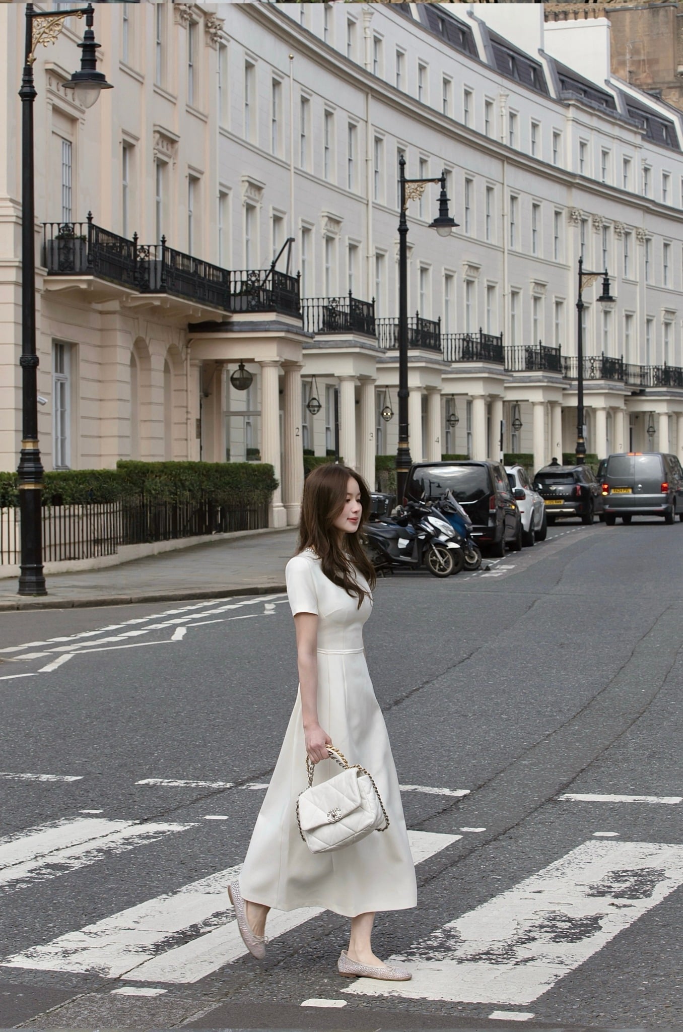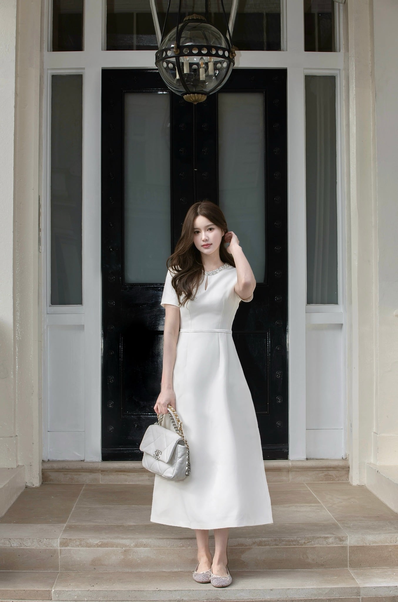 - Thân váy midi dáng xòe nhẹ, độ dài qua gối mang lại cảm giác trang nhã. Tà váy đổ tự nhiên, tạo hiệu ứng chuyển động mềm mại khi bước đi.